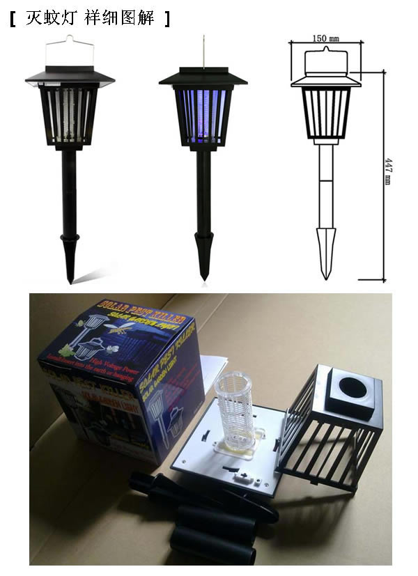 太阳能灭蚊灯不需要电线和电源的节能产品。用太阳能电池板给两节可充电电池充电,充满电后可使用8小时到12小时。1个白色的LED灯可照明,2个紫色的LED等?a href='http://www.stongit.com.cn/' target='_blank'>美次米樱?/span>LED灯外的金属网放出高压电杀死蚊子.室内、室外均可使用。有光线感应装置〔光敏电阻〕